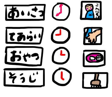 | 今日は見通しが安心につながる事、 言葉に拒否やパニックになる場合の対応について お伝えいたします。😊💕🍀 他の方からも 子どもの声が苦手なのは聴覚過敏でしょうか? というコメントamebloでいただきましたので、補足致します(^^) ◯急に聞こえる大きな音を嫌がる ◯いつも同じ音を嫌う傾向がある ◯家電など生活の中の音を異常に気にして嫌がる ◯大きな音でなくても、両手で耳をふさぐ ◯たくさんの音が聞こえる場所が嫌、落ち着きがない などが聴覚過敏の傾向としてあると思います。 私はドクターではないので、診断はできませんが、 赤ちゃんの声や急に発する子どもの声は高い音ですし、鳴き声なども苦痛の方も聴覚過敏の方には多いと伺います。 その場を離れて落ち着くなら様子を見ても良いと思いますが、落ち着かず耳を塞いだり、急に走り出したりする場合は危険を伴うのでかかりつけ医か、耳鼻咽喉科に相談するのも手段だと思います☺️ ということで、本題です。 発達障害や自閉スペクトラム症等のお子様の中に 次の見通しがない事を恐怖に感じる事があります。 予測ができない事が不安になるんですね。 さらに、急に現れる 『おしまい』や 『ダメ』という言葉 ![]() には、絶望感を感じる場合も、、、 次に何があるか分からない。 そんな不安と、 楽しいこととは永遠のお別れになる様な 錯覚を感じることもあるです。 そうなってくるとどうするか、、、 抵抗します。 その際にいくら言葉で説明しても、 音過敏なら情報は入りにくいし、 興奮してたりパニック時ならさらに話は入りません。 予測不能な状態が苦手である特性を持つお子様に対して、整理され、構造化された環境をつくる為のティーチプログラムというものもありますが、 特別支援学校や学級では 1日の流れやタイマーを使って 始まりと終わり、 次に何があるかを知らせる支援を していることが多いです。 ![]() ⬆️こんな感じですね。 ルーティンをつくっていきながら、精神的に安定する。 もちろん、日常的に変わることもあります。 ルーティンをあえて(事前に知らせて) 崩して順番を変える事も行う場合もあります。 構造化する事で、見通しをもち、 第一は安心、安定ができる事がねらいです(^^) タイマーは小学生などでは、数字がわかりますが、 幼児さんには難しいですよね。 そんな時にはこちら💁♀️