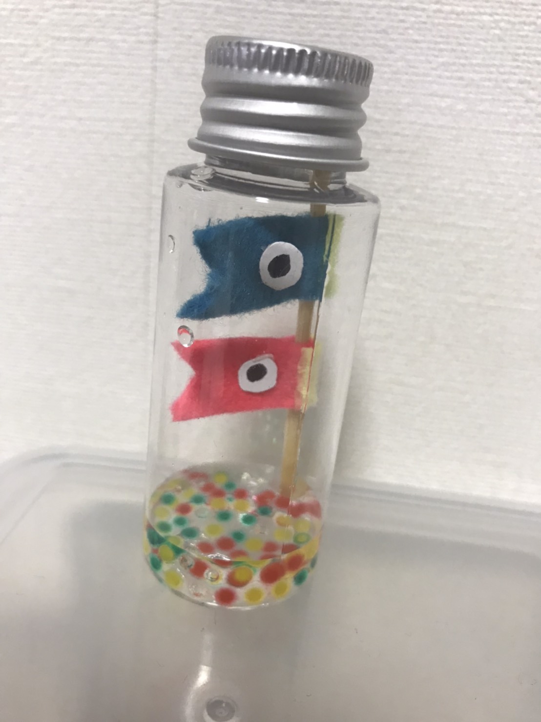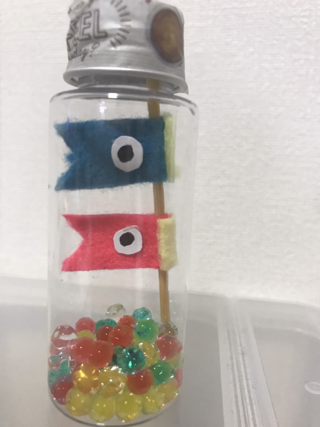 簡単可愛く100均の材料で作れちゃいます。 準備物 〇爪楊枝 〇シールフェルト 〇膨らむぷるキラボール ![]() 〇水少量 〇ハサミ 〇マスキングテープ 〇ミニボトル @シールフェルトを3枚準備します。 ![]() A大きさに切ります。 ![]() シールフェルトは裏にマス目があるから便利です(^^♪ B半分に折って(折ると大体3cmくらい)尻尾を切ります。 ![]() Cピンクも切ります。 ![]() D爪楊枝にシールをはがしながら、半分ずつ付けます。 ![]() Eピンクも付けます。 ![]() F口をつけて ![]() G目をつける ![]() H膨らむビーズを少量の水と一緒に水ボトルに入れる ![]() Hこいのぼりを入れたら ![]() I膨らんでくると完成!! ![]() こんな感じに膨らみます↓ ![]() ![]() YouTubeにのせてます。こちらもどうぞ(^^♪ |