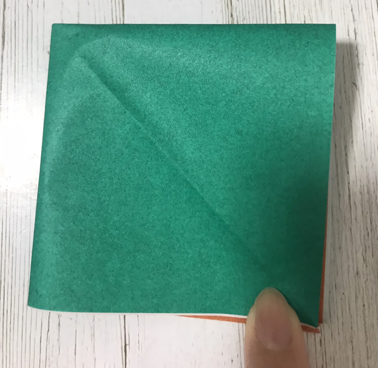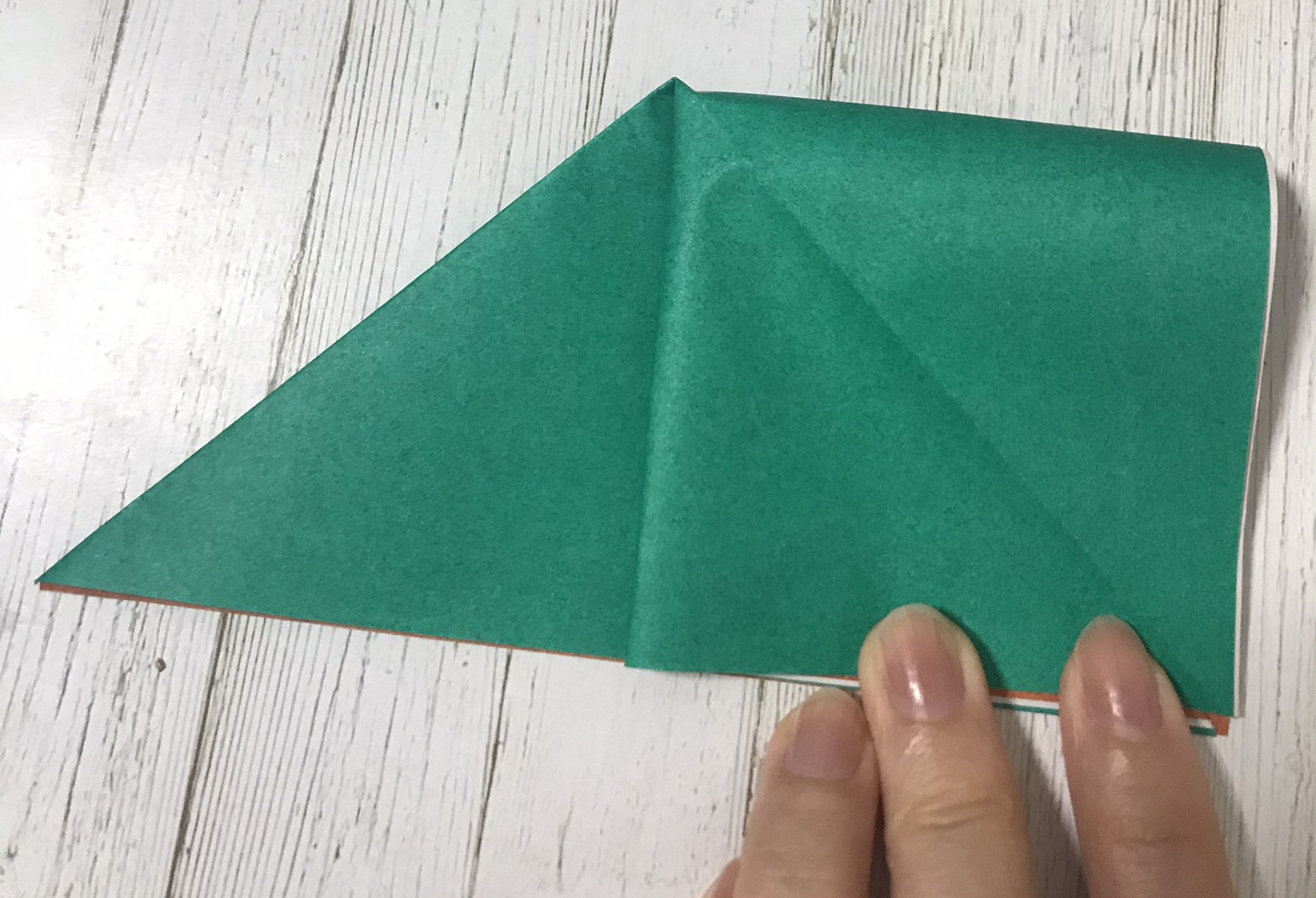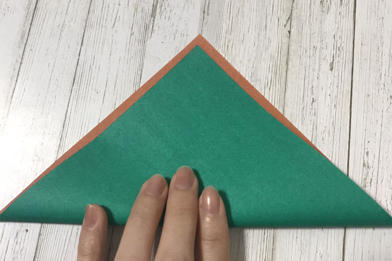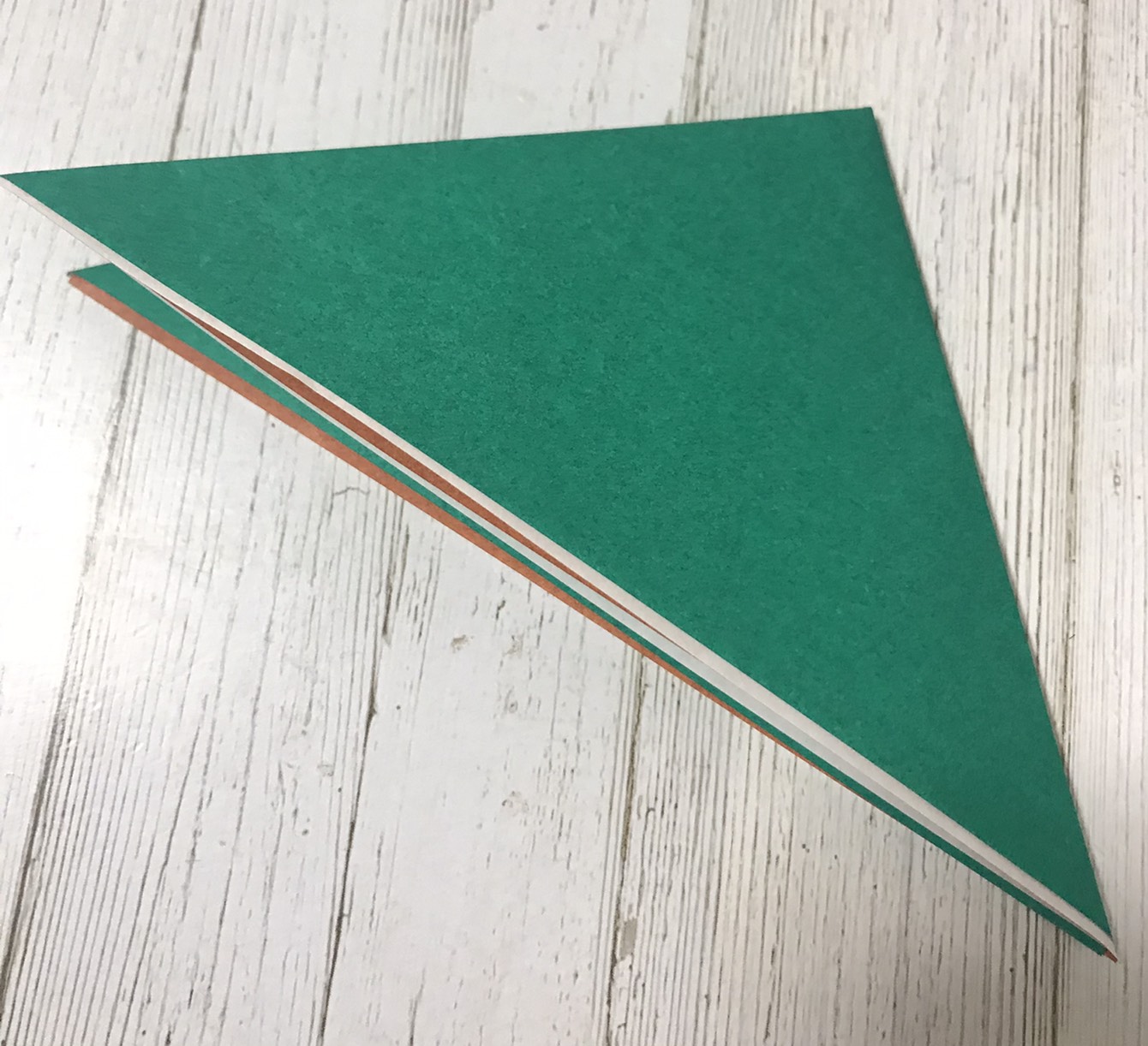 ②重ねて三角に折ります。↓