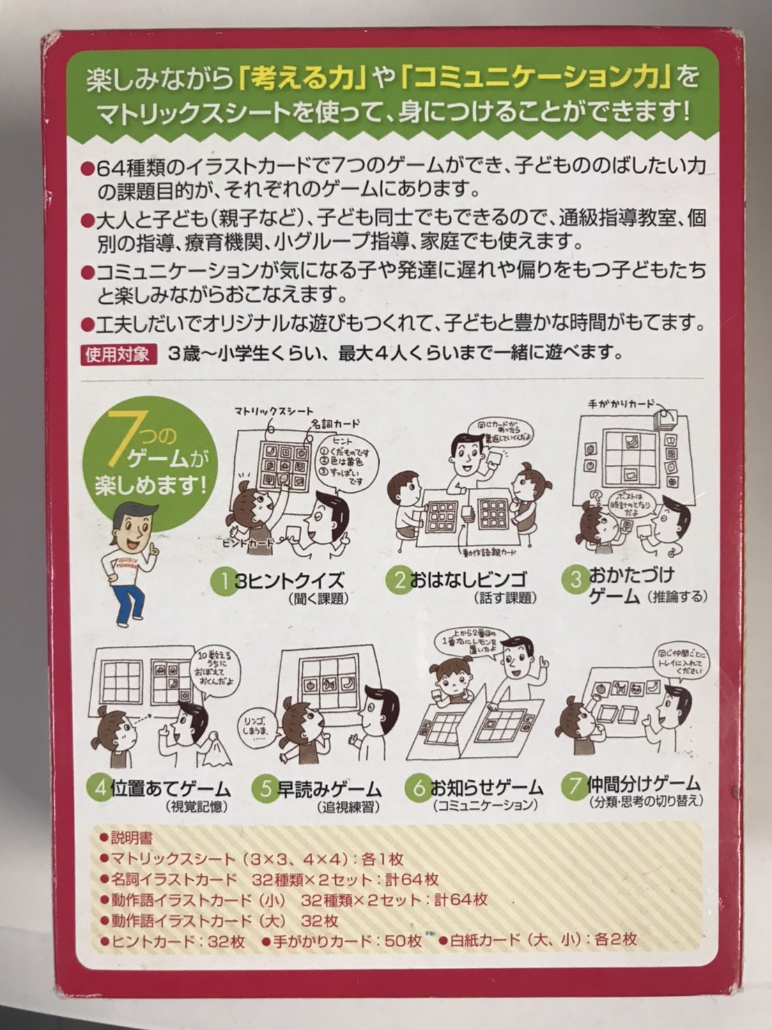 | 施設では、あそびっくす!まなびっくす!という教材を使ってソーシャルスキルゲームを行うことがあります。 先ほど、紹介した想像力クイズもこの教材で出来ます。教材では3ヒントクイズと言っています。 ①3ヒントクイズ(聴く課題)②おはなしビンゴ(話す課題)③お片付けゲーム(推論する) ④位置あてゲーム(視覚記憶)⑤早読みゲーム(追視練習)⑥お知らせゲーム(コミュニケーション) ⑦仲間分けゲーム(分類・思考の切り替え)カテゴリ分け 想像力クイズだけでなく、7つのゲームを行うことができるのでおススメです('ω')対象年齢:3歳~小学生ぐらい、最大4人位まで遊べます。 |
